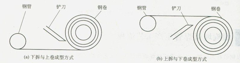 ①應(yīng)該保證鋼帶卷制成鋼管的彎曲方向與在鋼卷的自然彎曲方向保持一致。即上拆型式適用于下卷成型方式,下拆型式適用于上卷成型方式,這樣就可以最大限度地減小鋼帶變形對(duì)于鋼管力學(xué)性能的影響,還可以減小成型過(guò)程中鋼帶變形彎曲力矩,從而減小設(shè)備負(fù)荷;