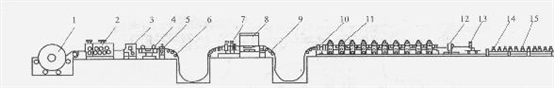 1-開(kāi)卷箱;2一矯平機(jī);3一剪切機(jī);4-焊接臺(tái);5-料尾夾送輥;6-地坑活套;7-夾送測(cè)速輥;8-沖孔沖床;9-地坑活套;10-立輥機(jī)架;11-工作機(jī)架;12 -土耳其頭矯正測(cè)速輥;13-沖模或飛鋸{14輸送輥道;15 -收集臺(tái)架