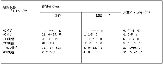 高頻直縫連續(xù)電焊管機組目前可生產(chǎn)φ5-660×0.5-15mm的水煤氣管道用管、鍋爐管、油管、石油鉆采管和機械工業(yè)用等中小口徑管。當采用排輥成型法時,產(chǎn)品規(guī)格可擴大φ400-122×6.4-22. 2mm。直縫電焊管以碳素鋼、低合金鋼或合金鋼熱軋或冷軋帶卷為坯料,其規(guī)格由焊接鋼管的規(guī)格需求決定。根據(jù)市場需求和原料條件確定。部分中小直徑直縫電焊鋼管機組的設(shè)計規(guī)模,產(chǎn)品方案如下表所示。