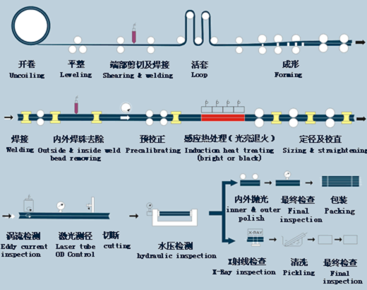 上圖是不銹鋼焊管的生產(chǎn)工藝流程圖。其中的成形和焊接兩個部分就是板(帶)變成圓管的主要工序。在焊接過程中,最常見的幾種焊接設(shè)備就是直縫高頻焊接設(shè)備、直縫雙面焊接工藝和螺旋埋弧焊接工藝。而MU-25M、MU-32M、MU-57M、MU-76M、MU-159M、MU-325M系列自動焊管機(jī)組也是焊管生產(chǎn)企業(yè)里常見的設(shè)備。