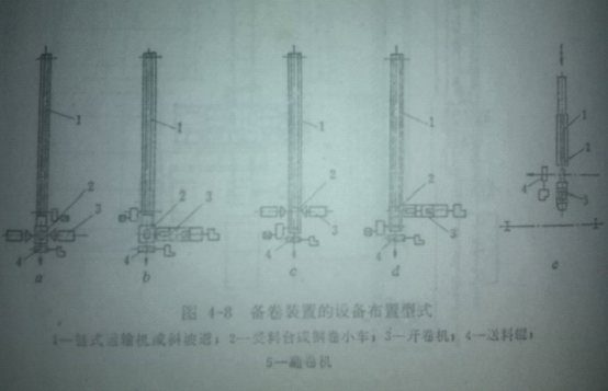 圖4-8a所示的備卷裝置是用吊車,懸臂吊或電動(dòng)小車將鋼卷放到鏈?zhǔn)竭\(yùn)輸機(jī)或斜坡輥道1上,此后鋼卷根據(jù)需要依次滾到受料臺(tái)2上,受料臺(tái)的升降臺(tái)交鋼卷提升到開卷機(jī)3的兩個(gè)分開的錐頭中間,然后開卷機(jī)兜售頭互相接近支撐鋼卷,再轉(zhuǎn)動(dòng)鋼卷使其前端處于便 于開頭的位置,經(jīng)直頭后,帶鋼前端送入隨后的送料輥或矯直機(jī)。