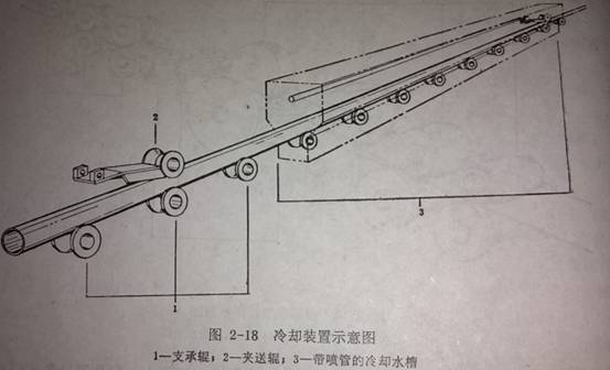 清除毛刺后的鋼管需要進(jìn)行水冷,一般在水冷以前應(yīng)當(dāng)經(jīng)過一段空冷,最好空冷到450℃左右,然后比水冷到150℃左右,而后進(jìn)入定徑機(jī),水冷裝置(圖2-18)應(yīng)當(dāng)可以調(diào)節(jié)水的流量和噴頭數(shù)量,水冷制度應(yīng)當(dāng)保證鋼管經(jīng)定徑和矯直后,不再由于空冷而產(chǎn)生彎曲變形。